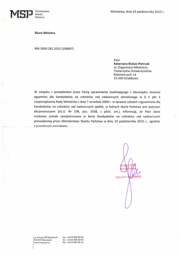 Adwokat, Pani Katarzyna Bialuk-Pietrzak, świadczyła usługi naszej firmie w zakresie konstruowania i opiniowania umów, dochodzenia należności, podwyższaniu kapita zakładowego Spółki, sprzedaży udziałów Spółki.