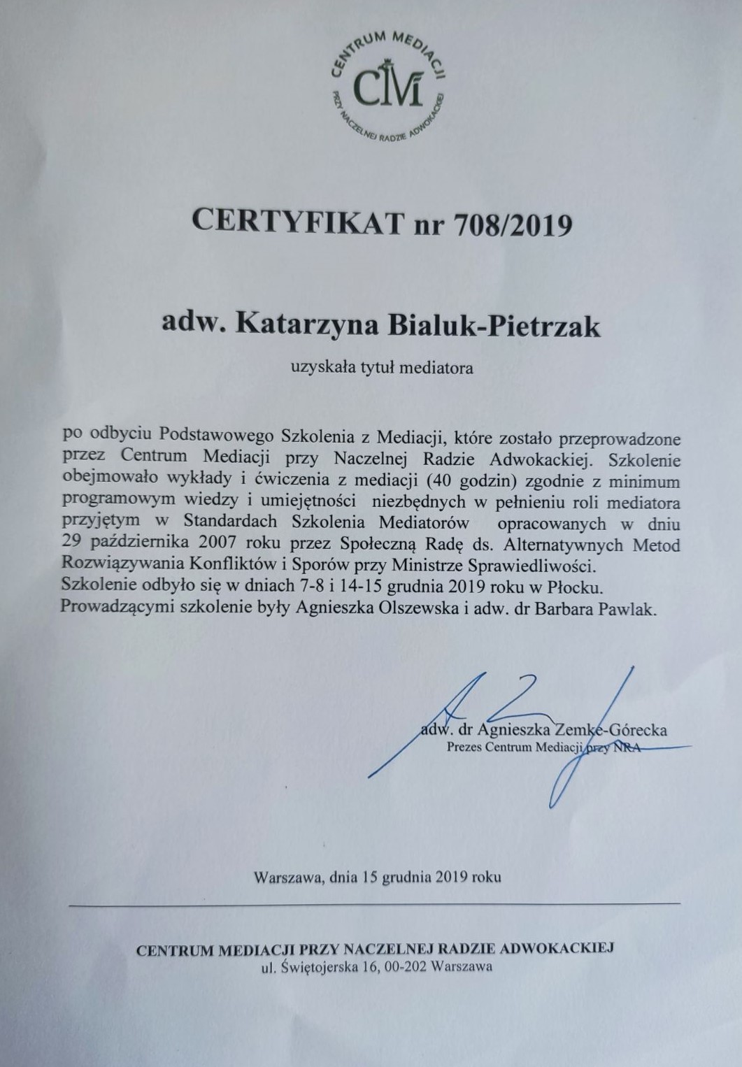 Założycielem Kancelarii Adwokackiej jest adwokat Katarzyna Bialuk-Pietrzak-absolwentka Wydziału Prawa i Administracji w Olsztynie, mgr administracji (2006), mgr prawa (2009). Wpisana na listę adwokatów Izby Płockiej od 2013 roku. Doświadczenie zawodowe zdobywała od 2003 r. jako asystentka w Kancelarii Radców Prawnych M. Sikorski I. Jacyno S.C. z/s w Olsztynie. Następnie od 2007 r. współpracowała z Kancelarią Radców Prawnych i Adwokatów „Nowakowski i Wspólnicy” sp.k. Specjalizuje się w bieżącej obsłudze prawnej klientów korporacyjnych, w tym zwłaszcza w postępowaniu rejestrowym spółek handlowych, redagowaniu i analizie kontraktów handlowych, dokumentów korporacyjnych. Posiada doświadczenie w prowadzeniu spraw odszkodowawczych, w sporach dotyczących zniesienia współwłasności. Z powodzeniem uczestniczy w postępowaniach karnych jako obrońca i pełnomocnik oskarżyciela posiłkowego/prywatnego. Posiada Podstawowe Szkolenie z Mediacji